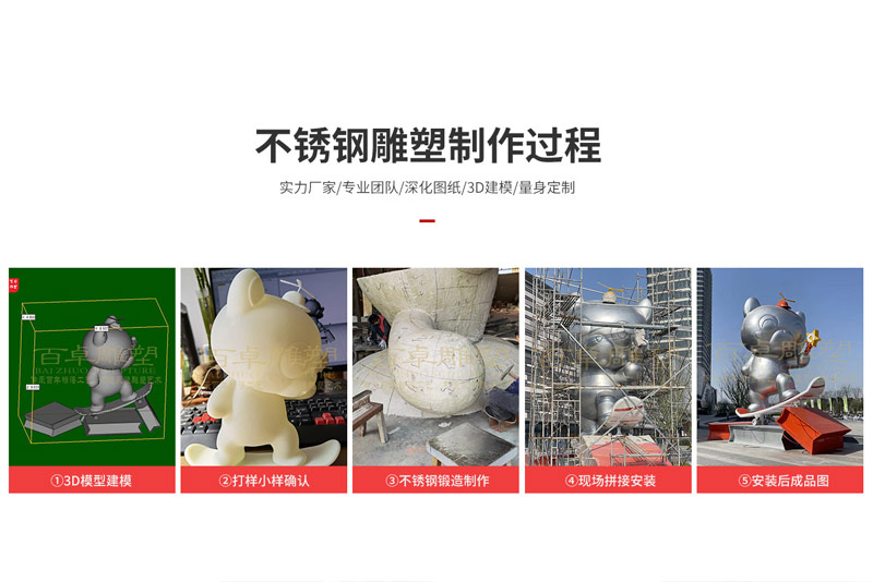 4、安裝:一般為焊接,較牢固,即雕塑本身的骨架與基座上預埋鐵焊接,預埋鐵下邊焊接鋼筋,根據雕塑的尺寸來確定鋼筋的長度以及預埋鐵的大小。為了美觀,安裝雕塑完畢后,基座會粘貼大理石或者花崗巖板材。