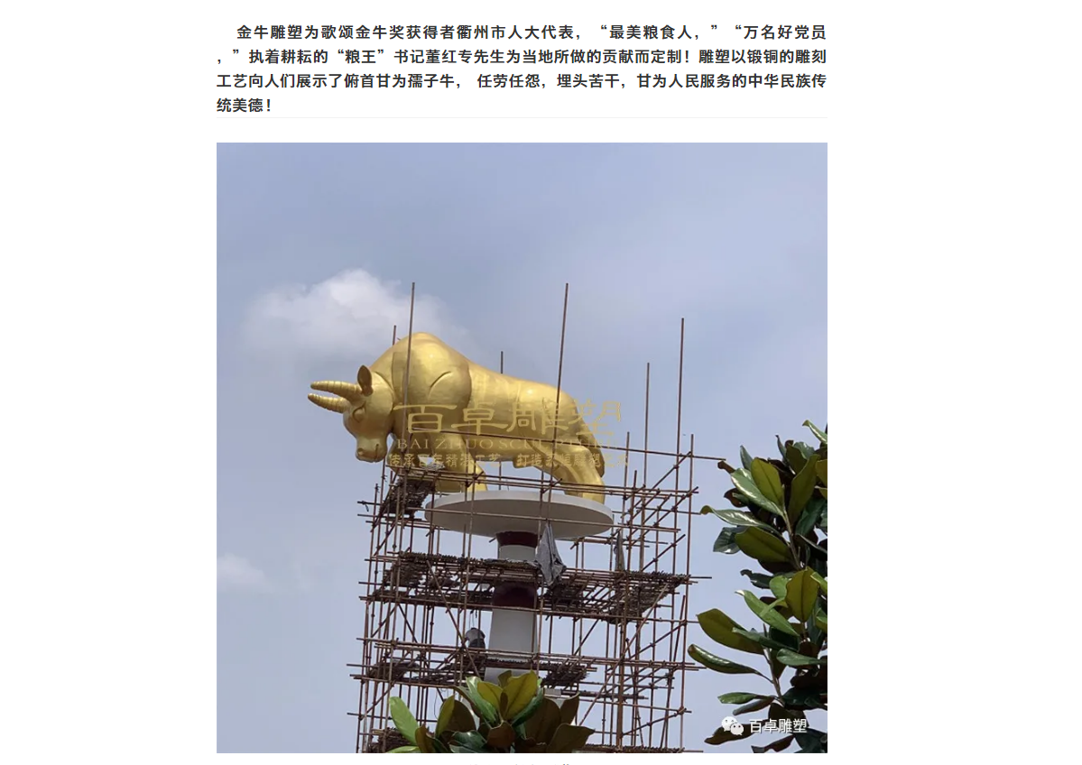 金牛雕塑為歌頌金牛獎(jiǎng)獲得者衢州市人大代表,“最美糧食人,”“萬(wàn)名好黨員 ,”執(zhí)著耕耘的“糧王”書(shū)記董紅專先生為當(dāng)?shù)厮龅呢暙I(xiàn)而定制!雕塑以鍛銅的雕刻工藝向人們展示了俯首甘為孺子牛, 任勞任怨,埋頭苦干,甘為人民服務(wù)的中華民族傳統(tǒng)美德!