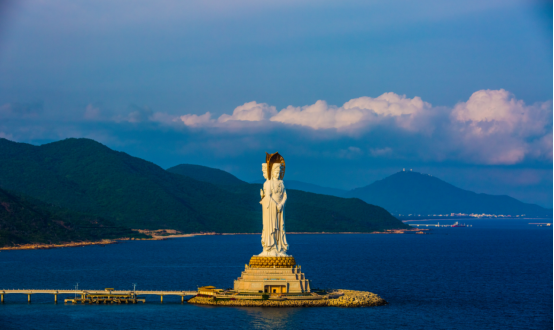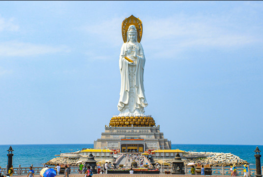 著名的海南三亞南海觀音像高達108米,造像工程歷時六載,是世界上最高的觀音像。圣像巍峨壯觀,莊嚴慈悲,像體為正觀音的一體化三尊造型,寶相莊嚴,腳踏108瓣蓮花寶座,蓮花座下為金剛臺,臺內是面積達15000平方米的圓通寶殿,金剛洲由長280米的普濟橋與陸岸相連。觀音圣像總體表示觀音"大慈與一切眾生樂、大悲拔一切眾生苦"的大慈大悲形象。如果說自由女神像代表了西方世界"自由"、"平等"、追求個性解放的思想,那么南山海上觀音圣像就是東方世界"慈悲"、"智慧"與"和平"的精神象征。工程因其規模宏偉、意義殊勝、被譽為世界級、世紀級的佛事工程。