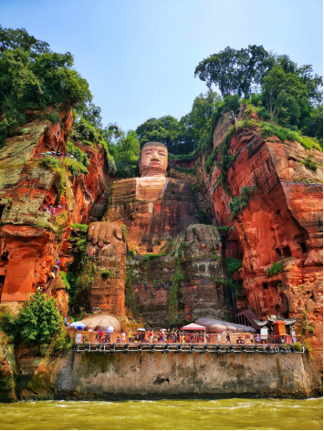 樂山大佛,它是依凌云山棲霞峰臨江峭壁鑿造的一尊大佛,高71米,是世界上最大的一座石刻大佛。樂山大佛又名凌云大佛,佛家經典建筑,位于四川省樂山市南岷江東岸凌云寺側,是中國最大的一尊摩崖石刻造像,始建于唐朝,歷時90載完成,樂山大佛頭與山齊,足踏大江,雙手撫膝,大佛體態勻稱,莊嚴殊勝,通高71米,頭高14.7米,腳背寬8.5米,腳面可圍坐百人以上,大佛的頭頂上共有螺髻1051個,遠看發髻與頭部渾然一體,實則以石塊逐個嵌就,栩栩如生,大佛為一尊彌勒座像,雍容大度,氣魄雄偉,是中國最大的一尊摩崖石刻造像,被譽為山是一尊佛,佛是一座山。在大佛左右兩側崖壁上,有兩尊高16米的護法天王石刻,與大佛一起形成了一佛二天王的格局,還有數百上千尊石刻塑像,宛然匯集成龐大的佛教石刻藝術群。