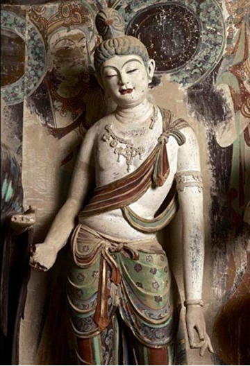 敦煌莫高窟第45窟的大勢至菩薩,此尊頭戴寶冠,發(fā)梳高髻,上身半裸,肌膚圓潤光潔,佩飾披巾、瓔珞、臂釧、手鐲等物,俊美中蘊(yùn)含著女性的嫵媚。他目光低垂,神情專注,仿佛正在側(cè)耳聆聽朝拜者的傾訴。他是慈悲和善良的化身,是理想和藝術(shù)創(chuàng)作的完美結(jié)晶。